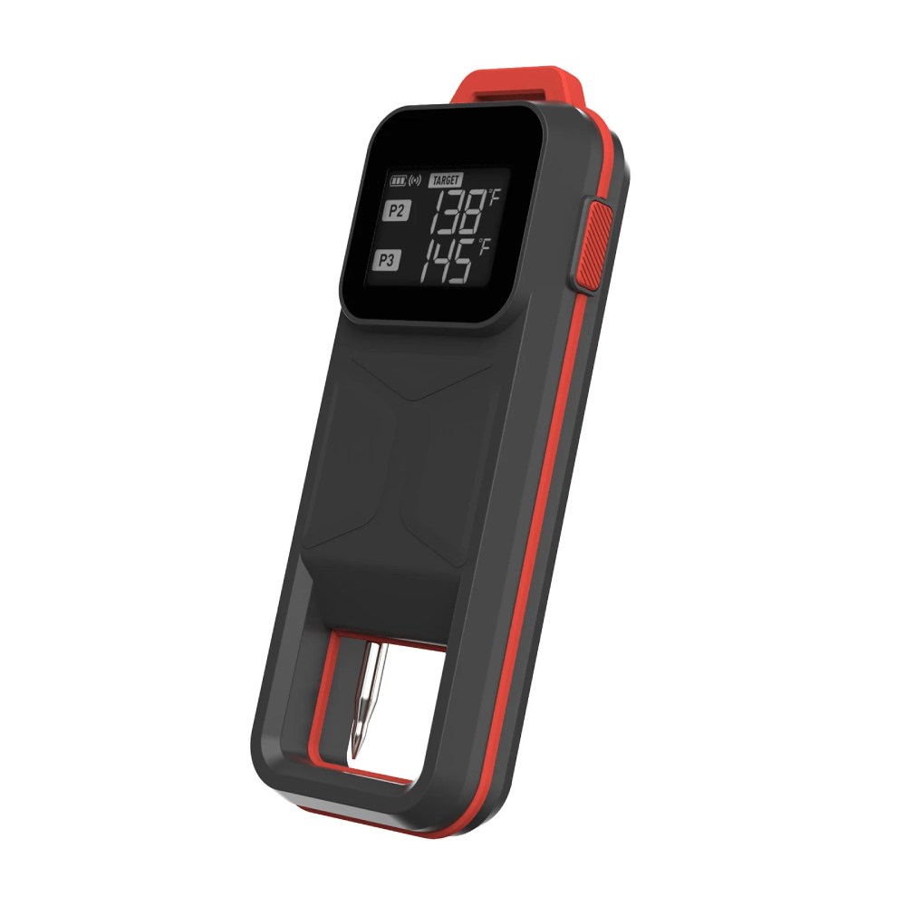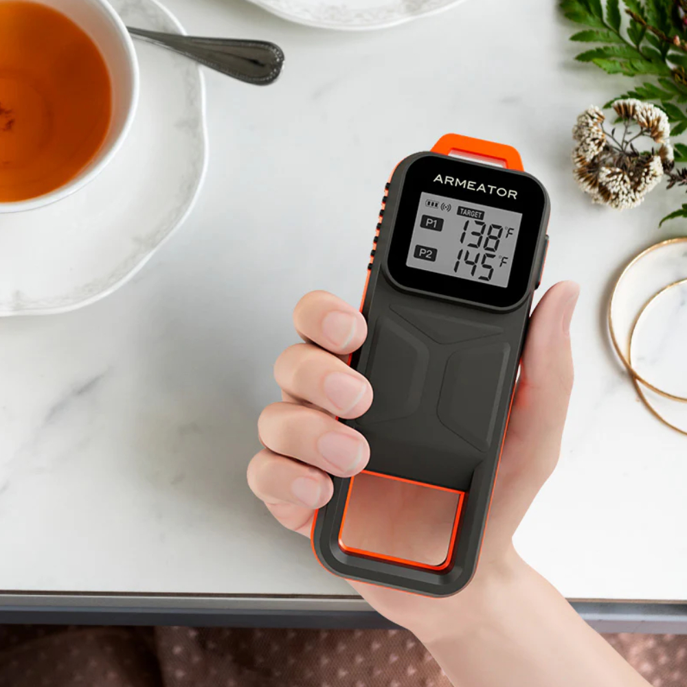 ARMEATOR B2 — это умный термометр для мяса, с помощью которого мы всегда можем быть в курсе температуры и процесса приготовления, даже не находясь рядом с духовкой или грилем. Девайс комплектуется двумя щупами с керамическими ручками — длинным и коротким. Это позволяет нам готовить сразу два разных блюда или узнавать температуру в разных частях одного большого куска. Главная фишка этой модели — измерение за 1 секунду. Нам достаточно вставить щуп в мясо и уже через секунду мы будем знать его текущую температуру. Для отображения данных устройство оснащено контрастным черно-белым дисплеем с крупными цифрами.