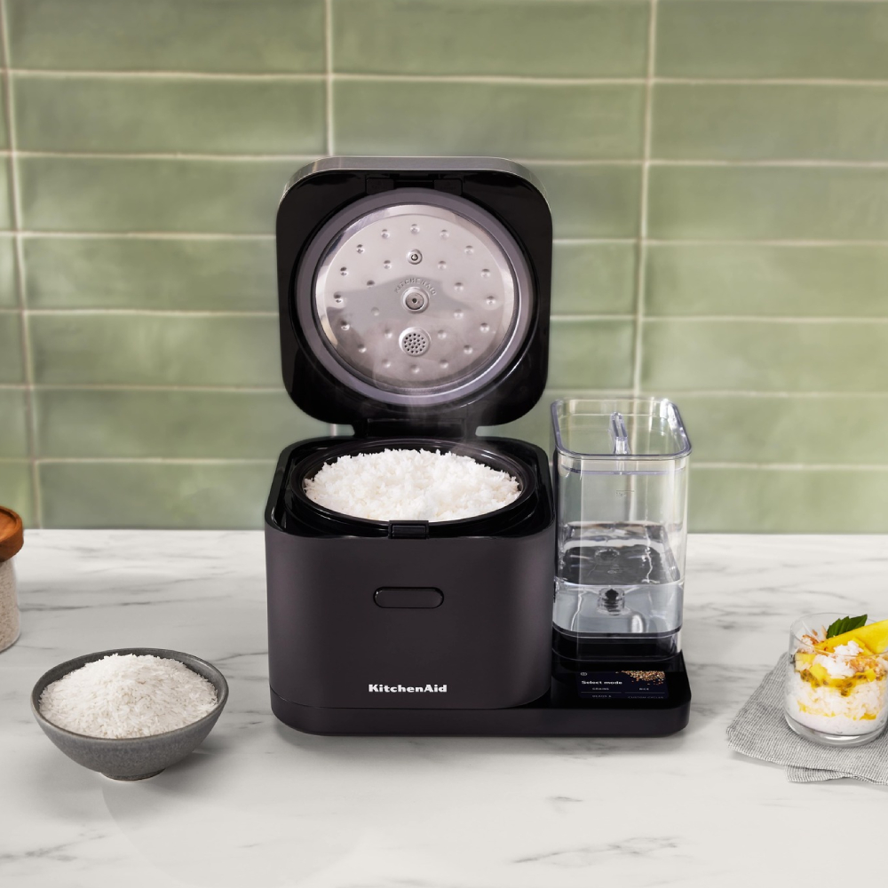 KitchenAid Grain and Rice Cooker комплектуется таймером, рассчитанным на 24 часа — мы можем добавить все нужные ингредиенты и получить готовое блюдо к моменту нашего пробуждения или возвращения с работы. Керамическая чаша в комплекте имеет антипригарное покрытие и её можно мыть в посудомойке. А съемный резервуар для воды легко ополаскивается под краном. Работает модель от сети с напряжением 120 В, поэтому для неё может понадобиться переходник.