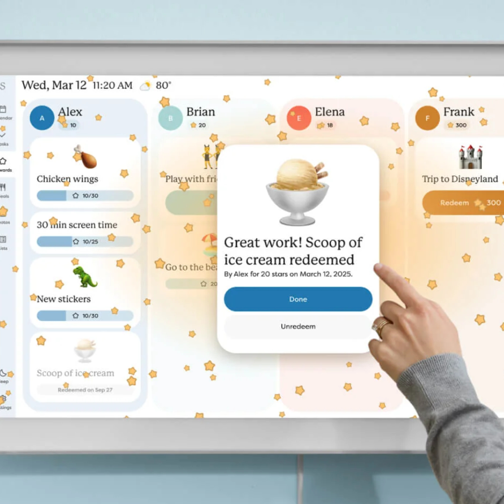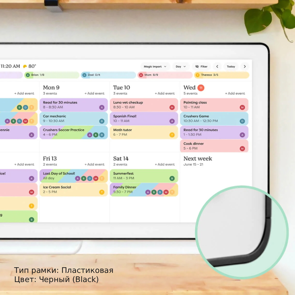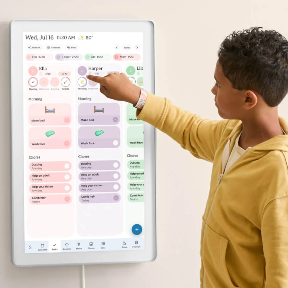 Skylight Calendar Max предназначен для всей семьи и позволяет нам создавать геймифицированные задания для детей, превращая рутинные дела, помощь по дому и выполнение домашней работы в веселую игру. Нам доступно четыре варианта интерфейса — день, неделя, месяц, а также список заданий. Мы можем устанавливать обратный отсчет для праздников и важных событий. Устройство также поддерживает трансляцию прогноза погоды, что особенно удобно в настенном формате. Режим сна помогает экономить электроэнергию — мы сами можем задать время пробуждения календаря и выключения экрана. А адаптивная яркость делает монитор безопаснее для глаз. Интерфейс на английском языке.
